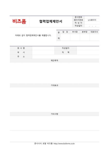 협력업체제안서입니다. 회사명, 작성일자, 부서, 직책, 주소, 제안목적, 기대효과, 기타사항 등의 항목으로 구성되어있습니다.