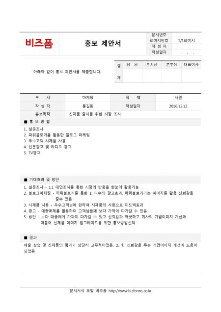 홍보제안서입니다. 부서, 직책, 작성자, 작성일자, 홍보목적, 홍보방법, 기대효과 및 방안, 결과 등의 항목으로 구성되어있습니다.