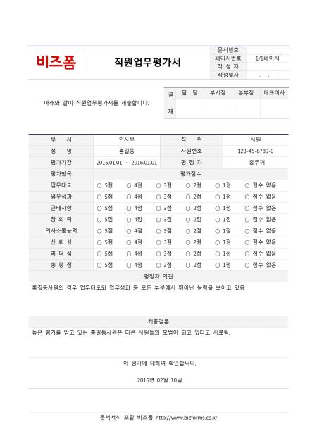 직원업무평가서입니다. 부서, 직위, 성명, 사원번호, 평가기간, 평정자, 평가항목, 평가점수, 평정자 의견, 최종결론 등의 항목으로 구성되어있습니다.