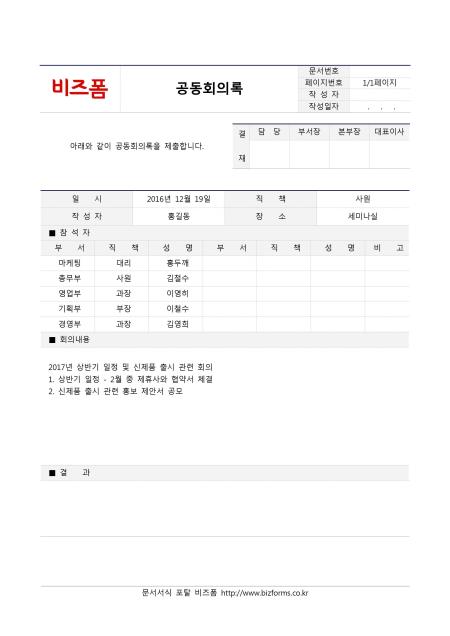 공동회의록입니다. 일시, 직책, 작성자, 장소, 참서자, 회의내용, 결과 등의 항목으로 구성되어있습니다.