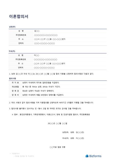 부부간에 이혼하기로 합의를 하기로 하고 작성하는 표준 이혼 합의서 입니다. 남편, 아내의 신상정보, 합의내역 항목으로 구성되어 있습니다.