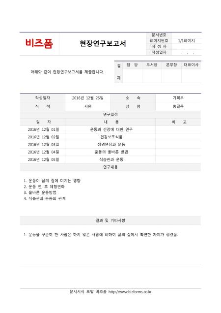현장연구보고서입니다. 작성일자, 소속, 직책, 성명, 연구일정, 일자, 내용, 비고, 연구내용, 결과 및 기타사항 등의 항목으로 구성되어있습니다.