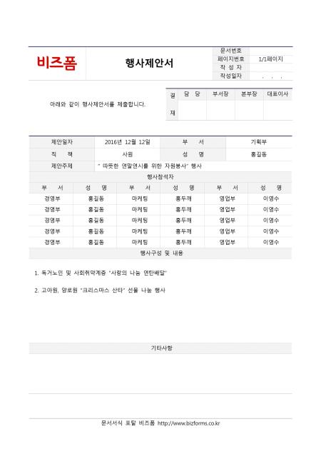 행사제안서입니다. 제안일자, 부서, 직책, 성명, 제안주제, 행사참석자, 부서, 성명, 행사구성 및 내용 기타사항 등의 항목으로 구성되어있습니다.