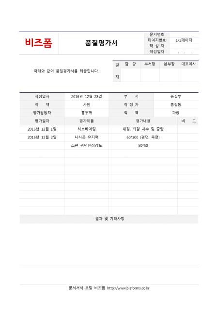 품질평가서입니다. 작성일자, 부서, 직책, 작성자, 평가담당자, 직책, 평가일자, 평가제품, 평가내용, 비고, 결과 및 기타사항 등의 항목으로 구성되어있습니다.