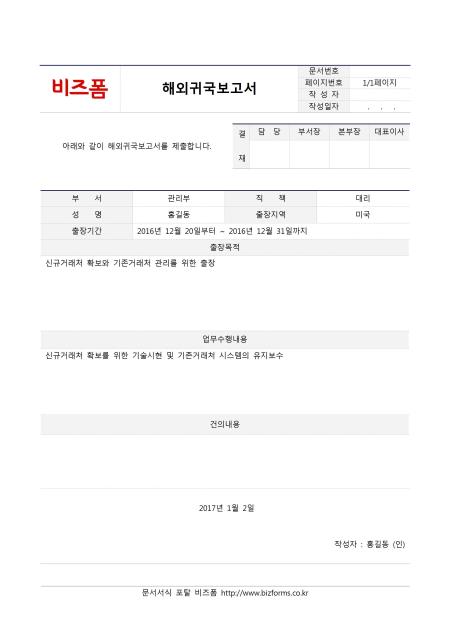 해외귀국보고서입니다. 부서, 직책, 성명, 출장지역, 출장기간, 출장목적, 업무수행내용, 건의내용 등의 항목으로 구성되어있습니다.