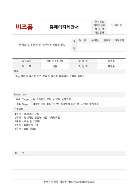 홈페이지제안서입니다. 작성일자, 업체명, 직책, 작성자, 목적, Taget User, 구축일정, 비고 등의 항목으로 구성되어있습니다.