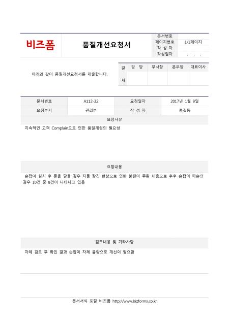 품질개선요청서입니다. 문서번호, 요청일자, 요청부서, 작성자, 요청사유, 요청내용, 검토내용 및 기타사항 등의 항목으로 구성되어있습니다.