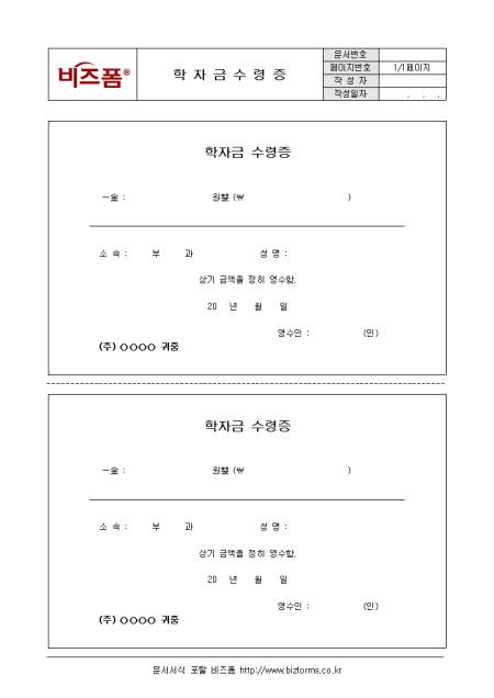 학자금을 받았을 경우 사용하는 서식이다. 구성요소는 금액, 소속, 성명등으로 구성되어 있으며 경리과에서 금액을 지출할때 확인받아야 한다.