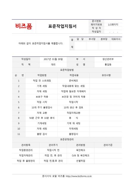 표준작업지침서입니다. 작성일자, 부서, 직책, 성명, 순번, 작업방법, 작업내용, 유의사항, 표준공정관리, 관리항목, 관리주기, 관리방법, 관리기준 등의 항목으로 구성되어있습니다.