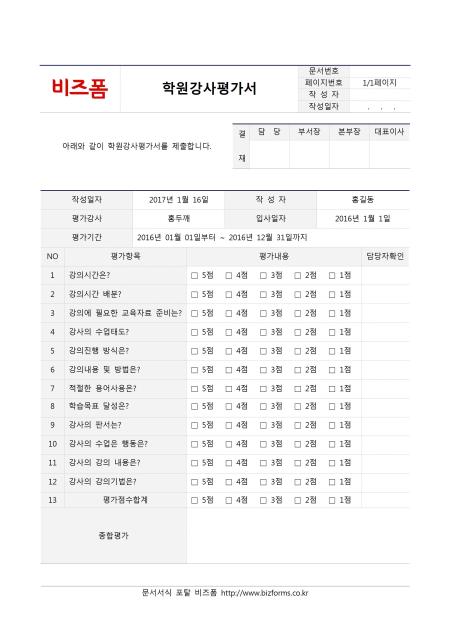 학원강사평가서입니다. 작성일자, 작성자, 평가강사, 입사일자, 평가기간, 순번, 평가항목, 평가내용, 담당자확인, 종합평가 등의 항목으로 구성되어있습니다.