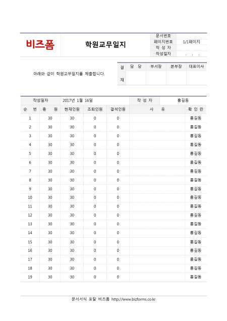 학원교무일지입니다. 작성일자, 작성자, 순번, 총원, 현재인원, 조퇴인원, 결석인원, 사유, 확인란 등의 항목으로 구성되어있습니다.