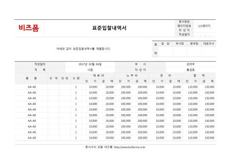 표준입찰내역서입니다. 작성일자, 부서, 직책, 작성자, 품명, 규격, 단위, 수량, 재료비 단가, 금액, 노무비 단가, 금액, 경비 단가, 금액, 합계 단가, 금액 등의 항목으로 구성되어있습니다.