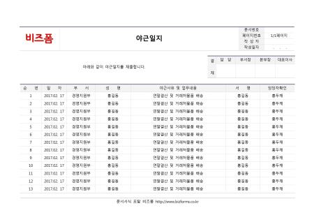 야근일지입니다. 순번, 일자, 부서, 성명, 야근사유 및 업무내용, 서명, 담당자확인 등의 항목으로 구성되어있습니다.