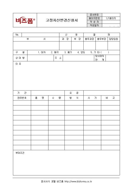 고정자산의 변동 사항을 기록/신청하는 고정자산변경신청서입니다. 부서, 구분, 이유, 부대조건 등의 항목으로 구성되어있으며 고정자산관리책임자는 고정자산의 변동 사항 발생 시 작성, 담당 부서장에게 보고합니다.