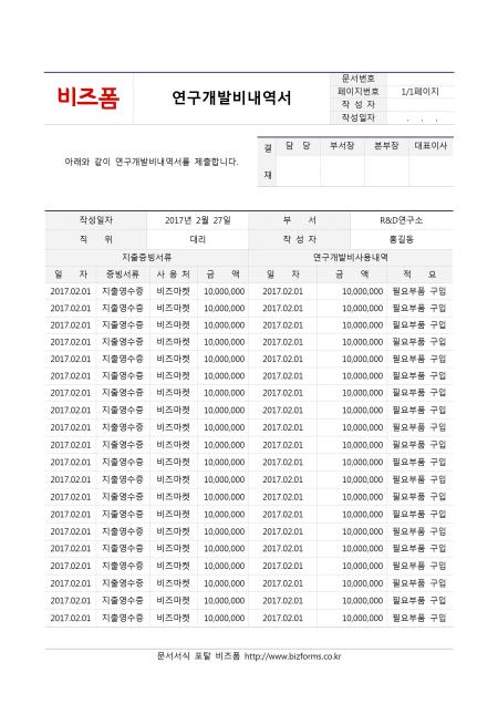 연구개발비내역서입니다. 작성일자, 부서, 직위, 작성자, 지출증빙서류, 일자, 증빙서류, 사용처, 금액, 연구개발비사용내역, 일자, 금액, 적요 등의 항목으로 구성되어있습니다.