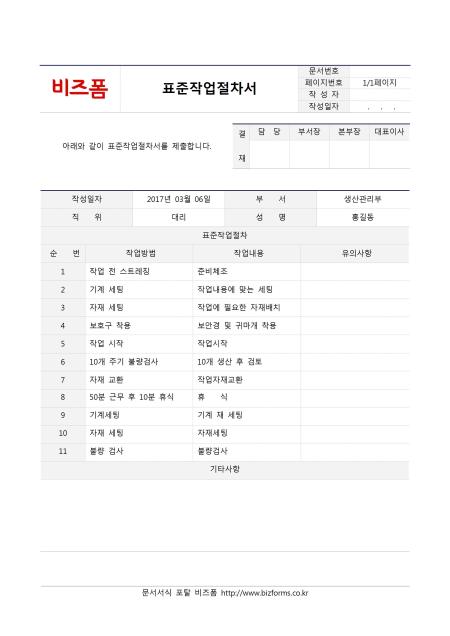 표준작업절차서입니다. 작성일자, 부서, 직위, 성명, 표준작업절차, 순번, 작업방법, 작업내용, 유의사항, 기타사항 등의 항목으로 구성되어있습니다.