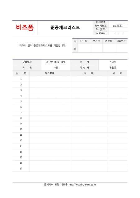 준공체크리스트입니다. 작성일자, 부서, 직위, 작성자, 순번, 평가항목, 상태, 비고 등의 항목으로 구성되어있습니다.