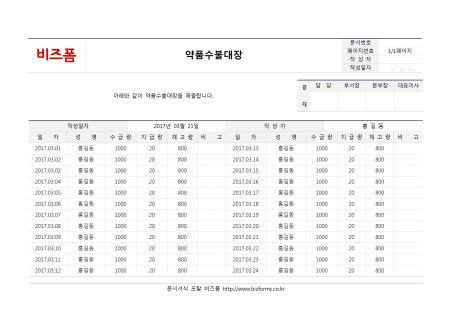약품수불대장입니다. 작성일자, 작성자, 일자, 성명, 수급량, 지급량, 재고량, 비고 등의 항목으로 구성되어있습니다.