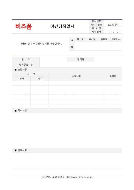 야간당직일지 입니다. 일자, 당직자, 당직중점사항, 순찰사항, 특이사항, 인계사항 등의 항목으로 구성되어있습니다.