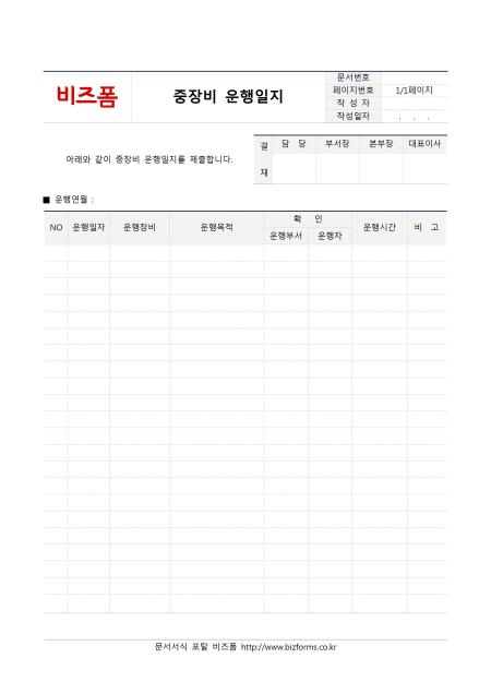 중장비운행일지 입니다. NO, 운행일자, 운행장비, 운행목적, 확인(운행부서, 운행자), 운행시간, 비고 등의 항목으로 구성되어 있습니다.