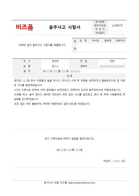 음주사고 시말서 입니다. 부서, 성명, 직급, 연락처, 일자, 내용등의 항목으로 구성되어 있습니다.