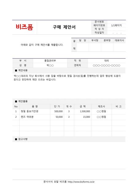 구매 제안서입니다. 부서, 직위, 성명, 연락처, 제안내용, 제안물품, 참고사항 등의 항목으로 구성되어 있습니다.