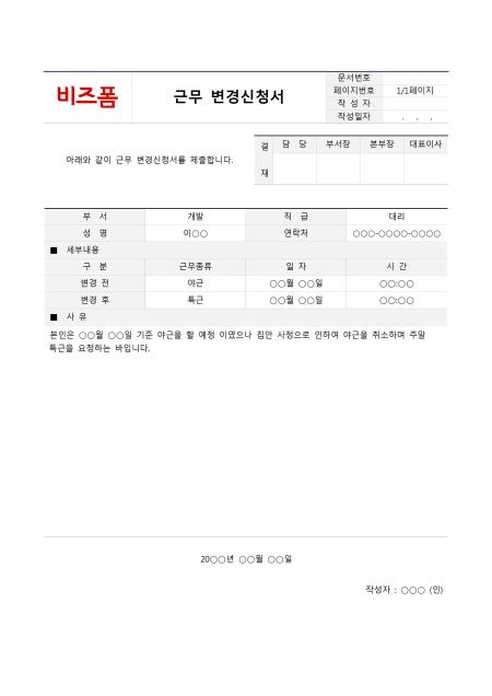 근무 변경신청서 입니다. 부서, 직급, 성명, 연락처, 구분, 근무종류, 일자, 시간, 변경전,후, 사유 등의 항목으로 구성되어 있습니다.