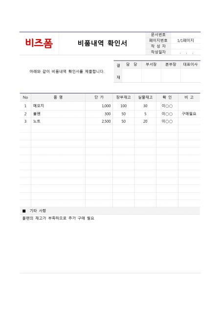 비품내역 확인서 입니다. No, 품명, 단가, 장부재고, 실물재고, 확인, 비고, 기타사항 등의 항목으로 구성되어 있습니다.
