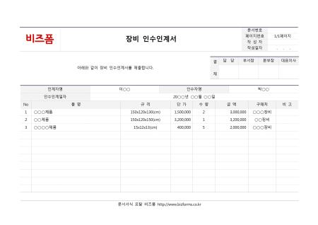 장비 인수인계서 입니다. 인계자명, 인수자명, 인수인계일자, No, 품명, 규격, 단가, 수량, 금액, 구매처, 비고 등의 항목으로 구성되어 있습니다.