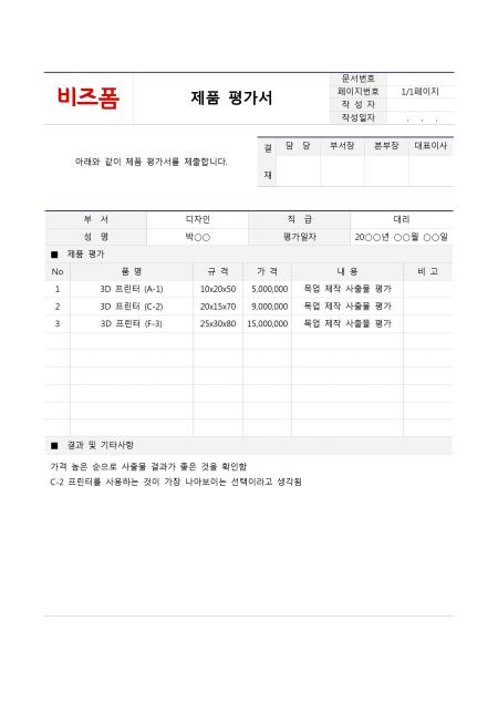 제품평가서입니다.부서, 직급, 성명, 평가일자, 제품평가, 결과 및 기타사항 등의 항목으로 구성되어 있습니다.