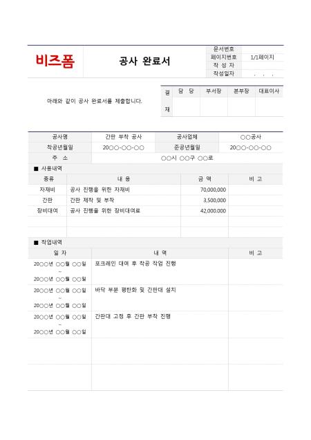 공사완료서입니다. 공사명, 공사업체, 착공년월일, 준공년월일, 주소, 사용내역, 작업내역등의 항목으로 구성되어 있습니다.