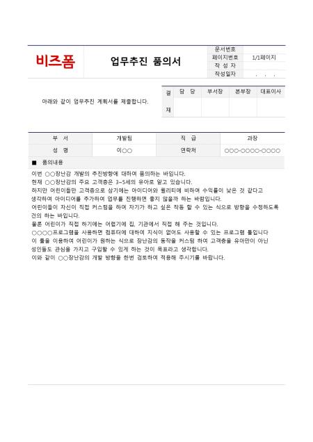업무추진 품의서입니다. 부서, 직급, 성명, 연락처, 품의내용 등의 항목으로 구성되어 있습니다.
