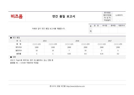 연간품질보고서 입니다. 연도, 품명, 제작개수, 불량개수, 불량률, 내용 등의 항목으로 구성되어 있습니다.
