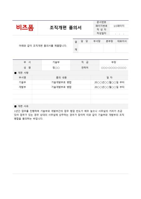 조직개편 품의서입니다. 부서, 직급, 성명, 연락처, 개편사항, 부서명, 품의내용, 일자, 개편사유 등의 항목으로 구성되어 있습니다.