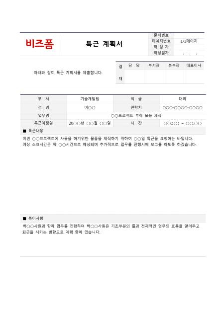 특근 계획서입니다. 부서, 직급, 성명, 연락처, 업무명, 특근예정일, 시간, 특근내용, 특이사항 등의 항목으로 구성되어 있습니다.