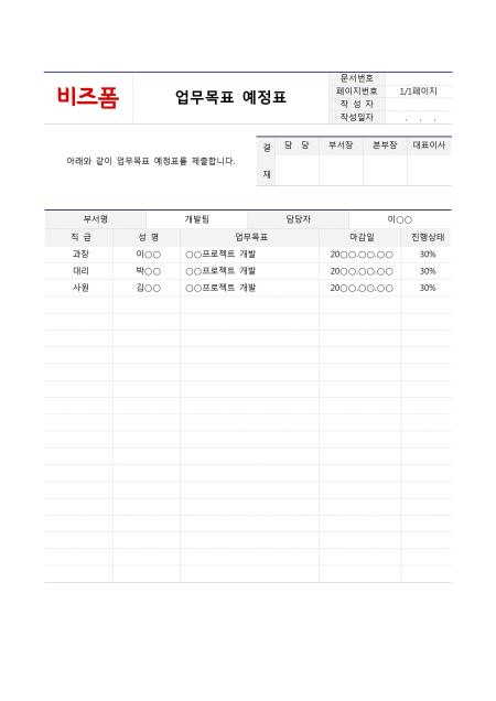 업무목표 예정표입니다. 부서, 담당자, 직급, 성명, 업무목표, 마감일, 진행상태 등의 항목으로 구성되어 있습니다.