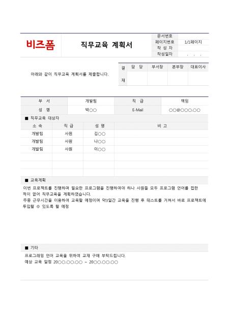 직무교육 계획서입니다. 부서, 직급, 성명, E-Mail, 소속,직급,성명,비고,교육계획,기타 등의 항목으로 구성되어 있습니다.