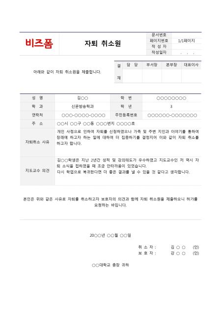 자퇴취소원입니다. 성명, 학번, 학과, 학년, 연락처, 주민등록번호, 주소, 자퇴취소사유, 지도교수의견 등의 항목으로 구성되어 있습니다.