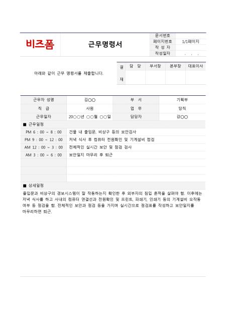 근무명령서입니다. 근무자 성명, 부서, 직급, 업무, 근무일자, 담당자, 근무일정, 상세일정 등의 항목으로 구성되어 있습니다.