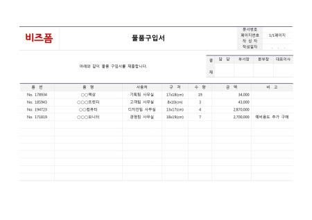 물품구입서입니다. 품번, 품명, 사용처, 규격, 수량, 금액, 비고 등의 항목으로 구성되어 있습니다.