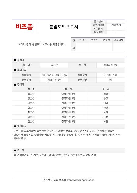 분임토의보고서입니다. 성명, 부서, 회의일자, 회의주제, 분임부서, 분임인원, 참석자 성명, 부서, 직급, 희의내용, 결과 등의 항목으로 구성되어 있습니다.