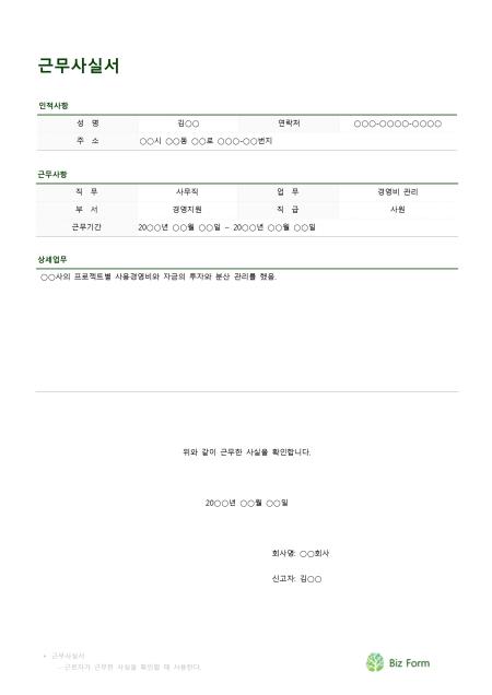 근무사실서입니다. 성명, 연락처, 주소, 직무, 업무, 부서, 직급, 근무기간, 상세업무 등의 항목으로 구성되어 있습니다.