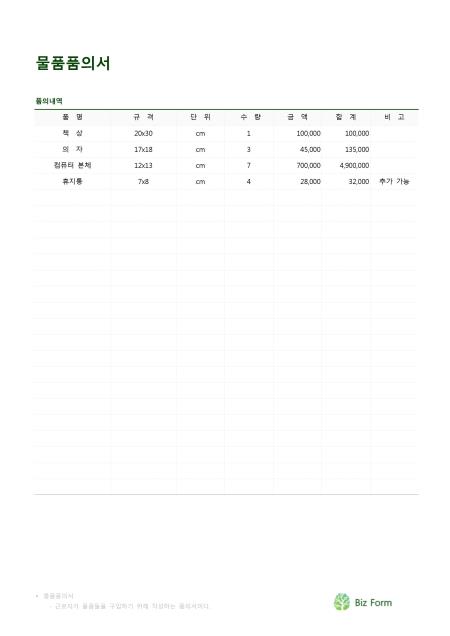 물품품의서입니다. 품명, 규격, 단위, 수량, 금액, 합계, 비고 등의 항목으로 구성되어 있습니다.