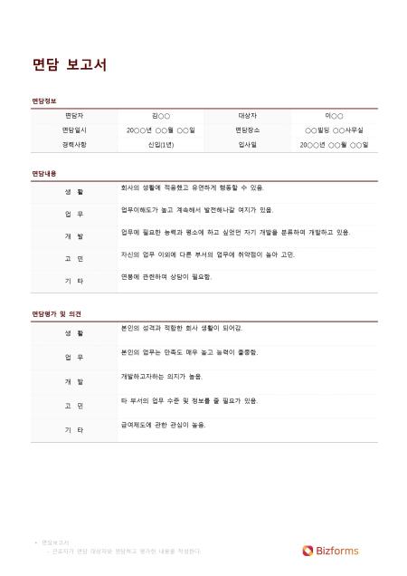 면담보고서입니다. 대상자, 면담자, 면담일시, 면담장소, 경력사항, 입사일, 면담내용 생활, 업무, 개별, 고민, 기타, 면담평가 및 의견 생활, 업무, 개별, 고민, 기타 등의 항목으로 구성되어 있습니다.