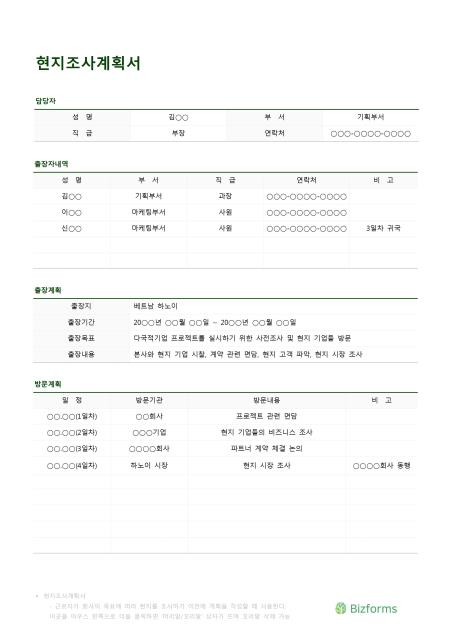현지 조사계획서입니다. 성명, 부서, 직급, 연락처, 출장자내역, 출장계획, 방문계획 등으로 구성되어 있습니다.