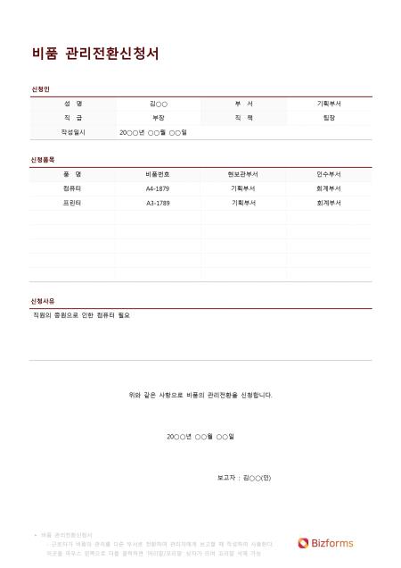 비품관리전환신청서입니다. 신청인 성명, 부서, 직급, 직책, 작성일시, 신청품목 품명, 비품번호, 현보관부서, 인수부서, 신청사유 등의 항목으로 구성되어 있습니다.