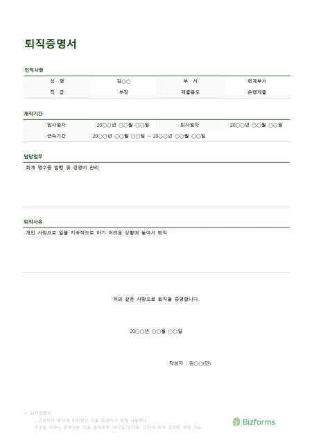 퇴직증명서입니다. 성명, 부서, 직급, 제출용도, 입사일자, 퇴사일자, 근속기간, 담당업무, 퇴직사유 등의 항목으로 구성되어 있습니다.