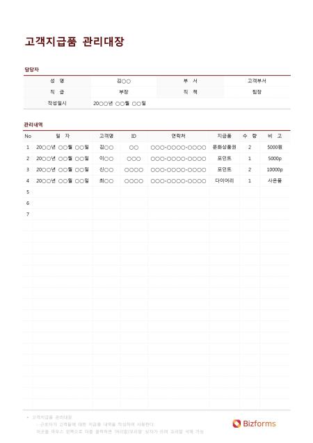 고객지급품관리대장입니다. 성명, 부서, 직급, 직책, 작성일시, No, 일자, 고객명, ID, 연락처, 지급품, 수량, 비고 등의 항목으로 구성되어 있습니다.