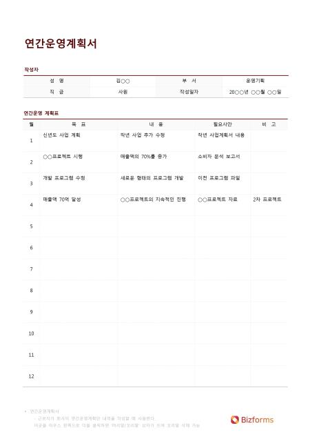 연간운영계획서입니다. 성명, 부서, 직급, 작성일자, 월, 목표, 내용, 필요사안, 비고 등의 항목으로 구성되어 있습니다.