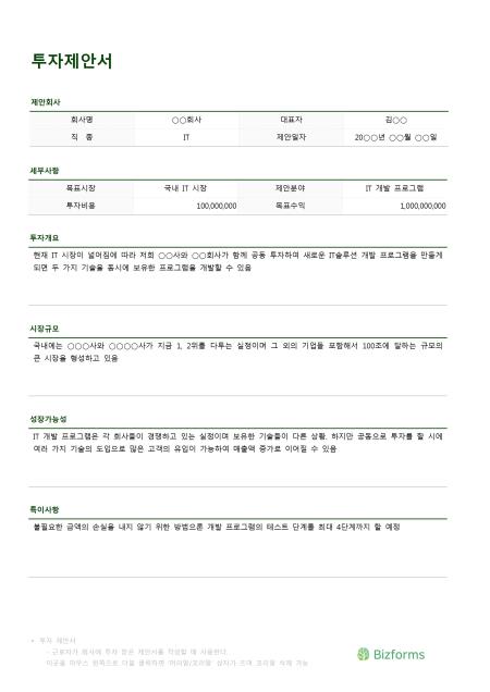 투자제안서는 기업이나 개인이 투자자에게 사업 아이디어나 프로젝트에 대한 투자를 요청하기 위해 작성하는 공식적인 문서입니다. 이 서식은 회사의 기본 정보부터 시작하여 투자 대상 사업의 세부 내용, 시장 분석, 재무 계획 등을 체계적으로 정리하여 투자자가 합리적인 투자 결정을 내릴 수 있도록 돕는 중요한 도구입니다.